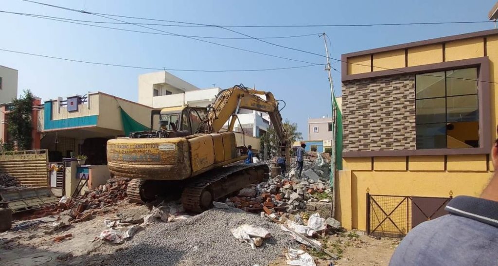 ఇంద్రధనుస్సు ప్రతినిధి: అమీనుపూర్ మున్సిపల్ పరిధిలోని వందనపురి కాలని రెండవ ఫేజ్ సర్వే నెంబర్ – 848లో రోడ్డు నెంబర్ 18 వద్ద రోడ్డును ఆక్రమించి నిర్మించిన ఇంటిని ఈ రోజు ఉదయం హైడ్రా అధికారులు కూల్చివేశారు. స్థానిక కాలని ప్రతినిధులు మున్సిపల్ సిబ్బందికి ఫిర్యాదు చేసినా, అధికారులు పట్టించుకోకపోవడంతో ఆర్. లింగమయ్య అనే కాలని వాసి హైడ్రాకు ఫిర్యాదు చేయడంతో హైడ్రా అధికారులు తనిఖీ చేసి రోడ్డు అని నిర్ధారించుకున్న పిదప కూల్చివేతకు రంగం సిద్ధం చేశారు. ఈ రోజు ఉదయం రోడ్డును ఆక్రమించి నిర్మించిన ఇంటిని భారీ యంత్రాల సాయంతో కూల్చివేశారు. కూల్చివేత సందర్భంగా ఎవరైనా ఆపటానికి ప్రయత్నించకుండా కట్టుదిట్టమైన భద్రతా ఏర్పాట్లు చేసుకుని ఇంటిని నేలమట్టం చేసింది హైడ్రా. ఈ సమాచారం టివి ఛానెల్స్ ప్రసారం చేయడంతో రోడ్డును ఆక్రమించి నిర్మాణాలు చేపట్టిన వారు ఆందోళన చెందుతున్నారు.
