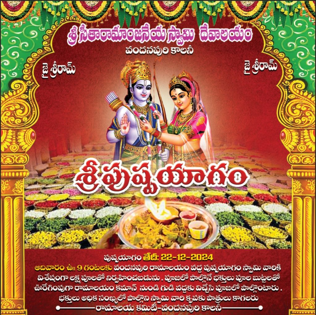 ఇంద్రధనుస్సు ప్రతినిధి: అమీనుపూర్ మున్సిపల్ పరిధిలోని వందనపురి కాలని రామాలయంలో ధనుర్మాసం సందర్భంగా 22-12-2024 తేది ఆదివారం ఉదయం 9 గంటలకు శ్రీ అభయ కోదండ రామస్వామి వారికి శ్రీపుష్పయాగం నిర్వహించబడుతుందని ఆలయ నిర్వాహకులు తెలిపారు. తిరుమల క్షేత్రంలో ప్రతి సంవత్సరం జరిగే విధంగా వైఖానస సంప్రదాయం ప్రకారం వందనపురి రామాలయంలో మొదటి సారి ఈ ఉత్సవాలు నిర్వహిస్తున్నట్లు నిర్వాహకులు తెలిపారు. వందనపురి మెయిన్ రోడ్ వద్ద నున్న రామాలయం కమాన్ నుంచి పుష్పయాగం కోసం విరాళాలు ఇచ్చిన భక్తులు వివిధ రకాలైన పూల బుట్టలతో ఊరేగింపుగా బయలుదేరి, రామాలయం చేరుకొని శ్రీ సీతారాముల వారికి పుష్పాలతో అర్చించే ఈ కార్యక్రమంలో భక్తులు పాల్గొని స్వామి వారి తీర్థ, ప్రసాదాలు స్వీకరించమని నిర్వాహకులు కోరుతున్నారు. శ్రీ పుష్పయాగంలో హోమం కూడా నిర్వహించడం వలన సంవత్సరం పొడవునా జరిగే స్వామి వారి ఉత్సవాల్లో తెలియక చేసే పొరపాట్లకు పరిహారం లభిస్తుందని ఆగమశాస్త్రం తెలియజేస్తున్నది. శ్రీపుష్పయాగం అనంతరం అన్న ప్రసాద వితరణ ఏర్పాటు చేయబడుతుందని నిర్వాహకులు తెలిపారు.
