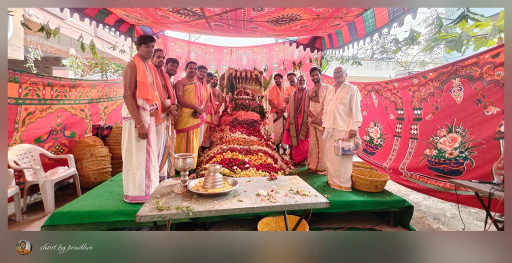 ఇంద్రధనుస్సు ప్రతినిధి: అమీనుపూర్ మున్సిపల్ పరిధిలోని వందనపురి కాలనీలో కొలువై ఉన్న శ్రీ అభయ కోదండ రామస్వామి వారి ఆలయంలో ధనుర్మాసం సందర్భంగా 22-12-2024 తేది ఆదివారం ఉదయం 10 గంటల నుంచి శ్రీపుష్ప యాగం వేడుకలు ప్రారంభమయ్యాయి. ముందుగా ఆలయ ప్రధానార్చకులు, తిరుపతి మరియు ద్వారకా తిరుమల నుంచి వచ్చిన ఋత్విక్కులు ఆలయానికి దిగువన ఏర్పాటు చేసిన సభావేదికపై శ్రీపుష్ప యాగం కార్యక్రమానికి శ్రీ వైఖానస సంప్రదాయం ప్రకారం సంకల్పం చెప్పి, పూజా కార్యక్రమాలు ప్రారంభించారు. శ్రీపుష్పయాగం నిమిత్తం విరాళాలు ఇచ్చిన భక్తులు వందనపురి పుర వీధుల్లో వివిధ రకాలైన పుష్పములు కలిగిన పూల బుట్టలను తలపైని పెట్టుకొని సన్నాయి మేళంతో ఉరేగింపుగా వందనపురి మెయిన్ రోడ్ నుంచి బయలుదేరి రామాలయం ప్రాంగణానికి చేరుకున్నారు. భక్తులు తెచ్చిన పూల బుట్టలను ఋత్విక్కులు స్వీకరించి, శ్రీపుష్ప యాగంలో వివిధరకాల పుష్పాలను శ్రీ సీతారాముల వారికి సమర్పించారు. ముందుగా విష్ణువుకు ప్రీతికరమైన తులసీదళాలతో శ్రీ పుష్ప యాగం ప్రారంభించారు. అనంతరం 11 రకాల పుష్పాలతో స్వామి వారికి అర్చన చేశారు. స్వామి వారి పుష్ప యాగంలో ఏ రకం పూలు స్వామికి అర్పిస్తున్నారో దానికి అనుగుణంగా మంత్రోచ్చారణ చేస్తూ, నృత్యం, గానం, వీణ తదితర సేవలను స్వామి వారి ముందు ప్రదర్శించారు. స్వామి వారికి సంవత్సరంలో నిర్వహించే అన్ని ఉత్సవాల్లో తెలియక జరిగే పొరపాట్లు పరిహరింపబడటానికి ఆలయంలో హోమం నిర్వహించారు. భక్తుల గోత్ర నామాలతో ప్రత్యేక పూజలు జరిపారు ఋత్విక్కులు. వైఖానస సంప్రదాయం ప్రకారం నిర్వహించిన శ్రీపుష్పయాగం తిరుమల క్షేత్రంలో సంవత్సరానికి ఒక పర్యాయం జరుపుతారు. వందనపురి రామాలయం ప్రతిష్ఠ జరిగిన తర్వాత మొదటి సారి శ్రీపుష్పయాగం నిర్వహించారు. అనంతరం భక్తులందరికీ స్వామి వారి అన్న ప్రసాద వితరణ చేపట్టారు. ఈ కార్యక్రమానికి ఎక్కువ సంఖ్యలో భక్తులు హాజరయ్యారు. సర్వేజనా సుఖినోభవంతు!! వేద ఆశీర్వచనంతో కార్యక్రమం ముగిసింది.