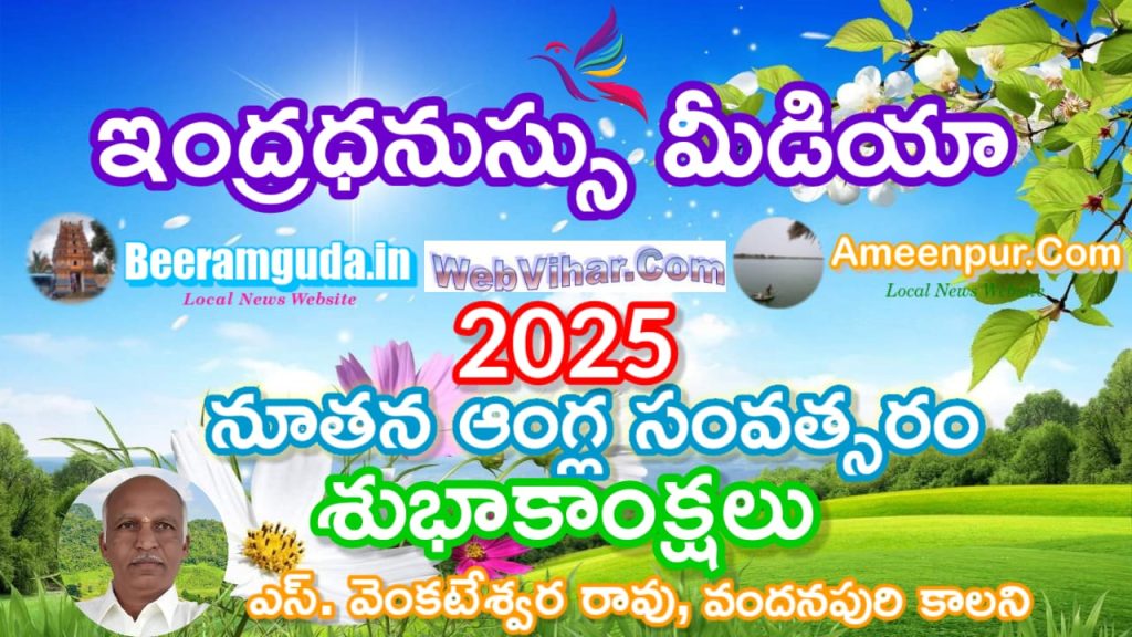 నూతన ఆంగ్ల సంవత్సర 2025 సందర్భంగా అందరికీ మంచి జరగాలని, ప్రజలంతా సుఖ శాంతులతో ఉండాలని ఇంద్రధనుస్సు మీడియా ఆకాంక్షిస్తోంది! పటాన్ చెరు నియోజకవర్గ ప్రజలకు, ప్రకటన కర్తలకు బీరంగూడ డాట్ ఇన్ లోకల్ న్యూస్ వెబ్ సైట్, ఇంద్రధనుస్సు మీడియా శుభాకాంక్షలు తెలియజేస్తున్నది.