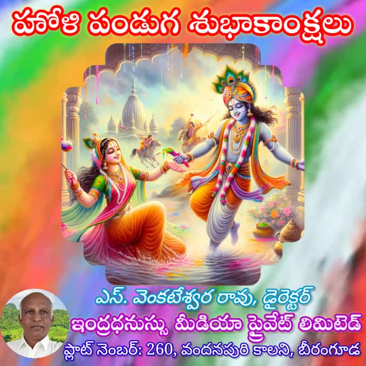 ఇంద్రధనుస్సు మీడియా న్యూస్ వెబ్ సైట్స్ వీక్షిస్తున్న వీక్షకులకు, మిత్రులకు, శ్రేయోభిలాషులకు మమ్మల్ని ఆదరిస్తున్న ప్రజలకు, ప్రకటనకర్తలకు హోళీ పండుగ సందర్బంగా హృదయపూర్వక శుభాకాంక్షలు తెలుపుతున్నాము.