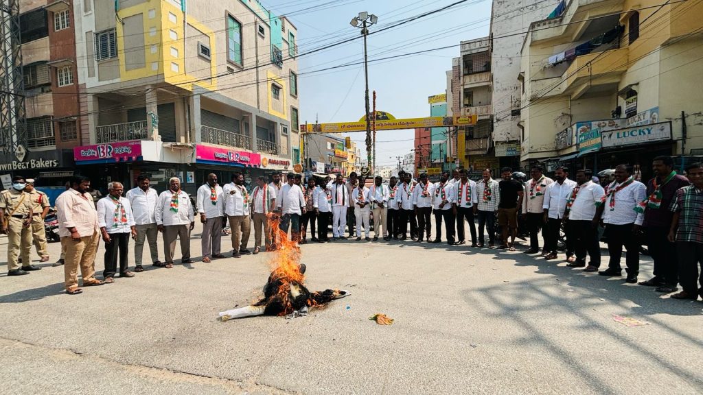 ఇంద్రధనుస్సు ప్రతినిధి: తెలంగాణ పిసిసి అధ్యక్షుడి పిలుపు మేరకు, పటాన్ చెరు నియోజకవర్గం కాంగ్రెస్ పార్టీ ఇన్చార్జి కాటా శ్రీనివాస్ గౌడ్ ఆదేశం మేరకు, అమీనుపూర్ మున్సిపాలిటీ కాంగ్రెస్ పార్టీ అధ్యక్షుడు జి. శశిధర్ రెడ్డి నేతృత్వంలో అమీనుపూర్ మున్సిపాలిటీ పరిధిలోని బీరంగూడ శివాలయం చౌరస్తాలో ఈ రోజు ఉదయం 11 గంటలకు “అసెంబ్లీ స్పీకర్ మీద అనుచిత వ్యాఖ్యలు చేసిన బిఆర్ఎస్ ఎమ్మెల్యే జగదీశ్వర్ రెడ్డి దిష్టిబొమ్మను” అమీనుపూర్ మున్సిపాలిటీ కాంగ్రెస్ నాయకులు దగ్ధం చేసి నిరసన వ్యక్తం చేశారు. దళిత స్పీకర్ మీద అనుచిత వ్యాఖ్యలు చేసిన జగదీశ్వర్ రెడ్డి వెంటనే బహిరంగ క్షమాపణ చెప్పాలని నాయకులు డిమాండ్ చేశారు. అగ్రకుల అహంకారంతో చేసిన వ్యాఖ్యలను వెంటనే ఉపసంహరించుకుని, బహిరంగ క్షమాపణ చెప్పాలని నాయకులు డిమాండ్ చేశారు.