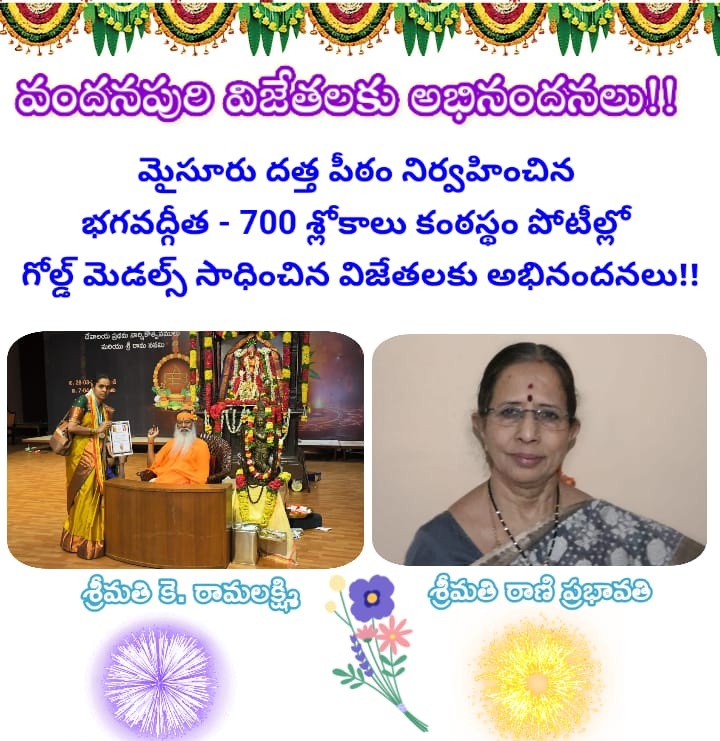 సంగారెడ్డి జిల్లా అమీనుపూర్ మున్సిపాలిటీ పరిధిలోని వందనపురి కాలనీకి చెందిన మహిళామణులు శ్రీమతి రాణి ప్రభావతి, శ్రీమతి కె. రామలక్ష్మి” భగవద్గీత 700 శ్లోకాలు కంఠస్థం పోటీలో” పాల్గొని అత్యుత్తమ ప్రతిభ కనబరచి మైసూరు దత్త పీఠం వారు అందించే గోల్డ్ మెడల్స్ సాధించారు. హైదరాబాద్ నగరంలోని దుండిగల్ అవధూత దత్త పీఠంలో శ్రీమతి కె. రామలక్ష్మి గారు శ్రీరామనవమి పండుగ రోజున శ్రీశ్రీశ్రీ గణపతి సచ్చిదానంద స్వామీజీ గారి చేతుల మీదుగా గోల్డ్ మెడల్, ప్రశంసాపత్రం అందుకున్నారు. శ్రీమతి రాణి ప్రభావతి గారు 17 మే 2025 తేదీన మైసూరు దత్త పీఠంలో అప్పాజీ వారి చేతుల మీదుగా గోల్డ్ మెడల్, ప్రశంసాపత్రం అందుకోబోతున్నారు. వందనపురి మహిళామణులు సాధించిన ఈ ఘనతకు వందనపురి కాలనీవాసులు వారికి అభినందనలు తెలుపుతూ, తమ ఆనందాన్ని వ్యక్తం చేస్తున్నారు.